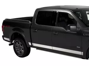 Add some style and protection with these stainless-steel rocker panel moldings. The highly polished moldings feature vehicle logo etched into the front door panels. Panels are custom fit for both sides of your truck. Constructed of highly polished 304 stainless-steel. Installs easily with pre-applied 3M automotive tape.